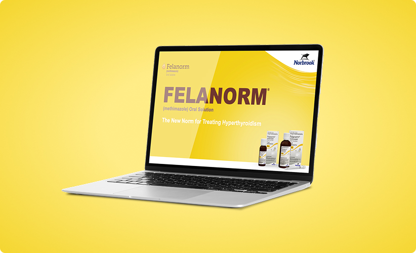As with all drugs, side effects may occur. The most commonly reported side effects are anorexia, vomiting, head/facial pruritus or edema, depression/lethargy, weight loss, anemia, elevated liver enzymes, skin lesions, elevated BUN, diarrhea and thrombocytopenia. Felanorm® Oral Solution is not for use in pregnant or lactating queens, or cats with renal, hepatic or hematological disorders. In some reported cases, the patients recovered after adverse signs were recognized, the drug was withdrawn and veterinary care was applied. In some cases, death (or euthanasia) has been reported as an outcome of the adverse reactions listed above. Methimazole has anti-vitamin K activity and may induce bleeding diathesis without evidence of thrombocytopenia. Please refer to the product insert for a complete list of warnings, potential side effects and prescribing information associated with Felanorm. To report suspected adverse drug events, for technical assistance or to obtain a copy of the Safety Data Sheet (SDS), contact Norbrook at 1-866-591-5777.